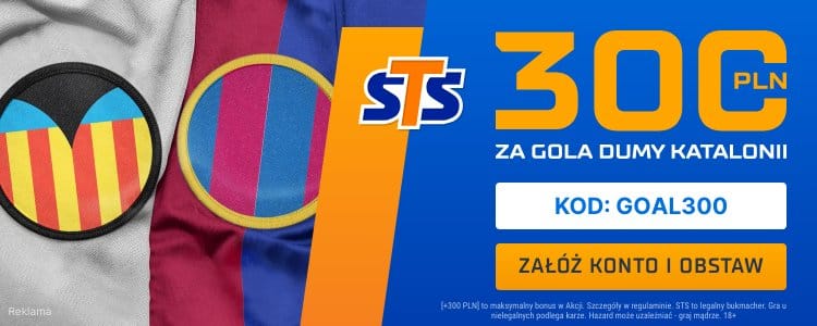 Jeżeli nie masz jeszcze konta w STS warto zwrócić uwagę na ofertę tego bukmachera, który nowym klientom oferuje bonus 300 zł za wytypowanie zwycięzcy meczu Valencia – Barcelona. Z oferty można skorzystać podając podczas rejestracji w STS kod promocyjny GOAL300.