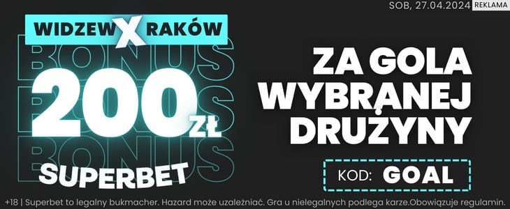 Specjalną promocję na sobotni mecz Widzew – Raków przygotował Superbet. Jeżeli podasz kod promocyjny GOAL podczas rejestracji będzie mógł zagrać zakład na choćby jednego gola Widzewa lub Rakowa po kursie 100.00. Dzięki tej ofercie możesz zgarnąć bonus o wartości 200 zł. Jak skorzystać z promocji?
